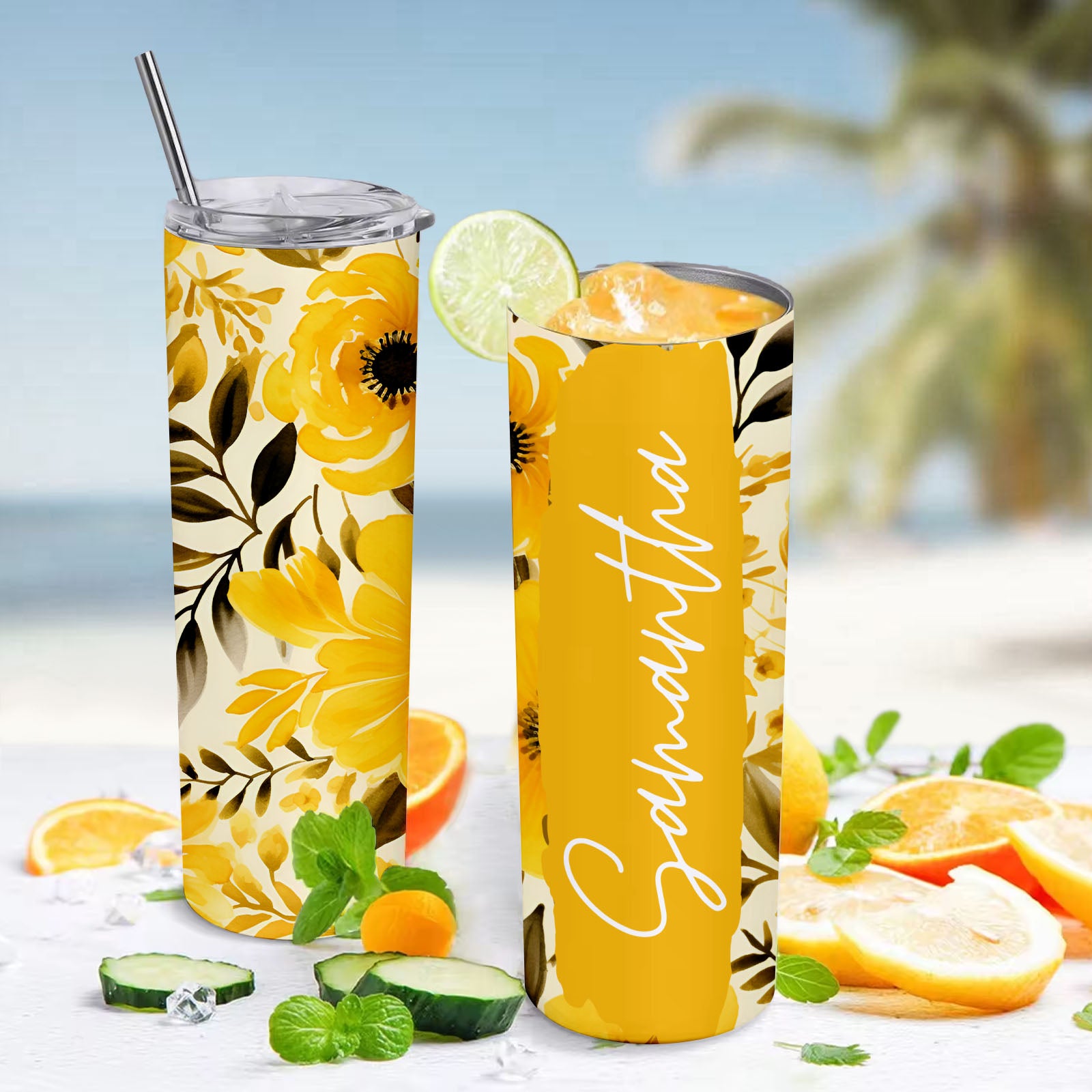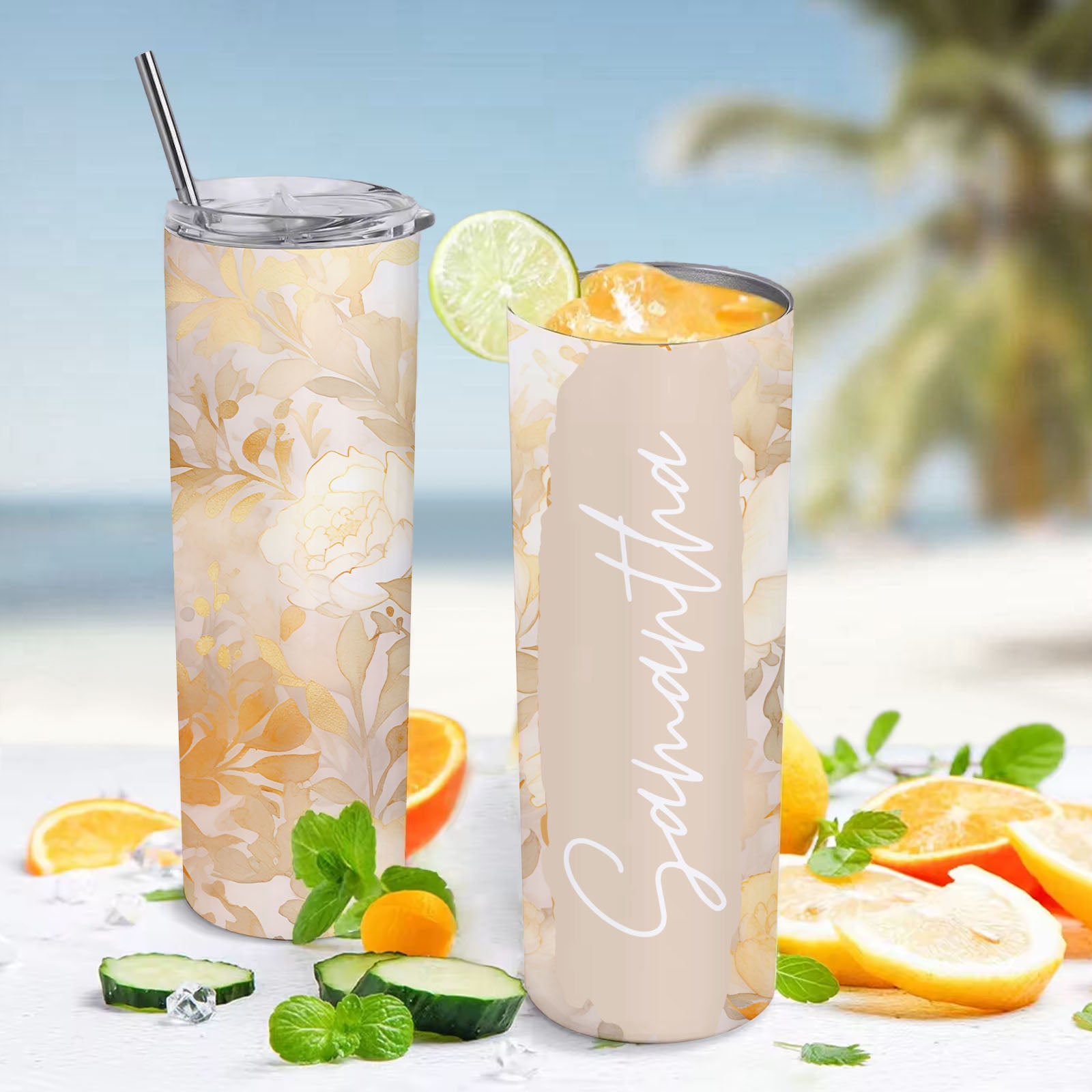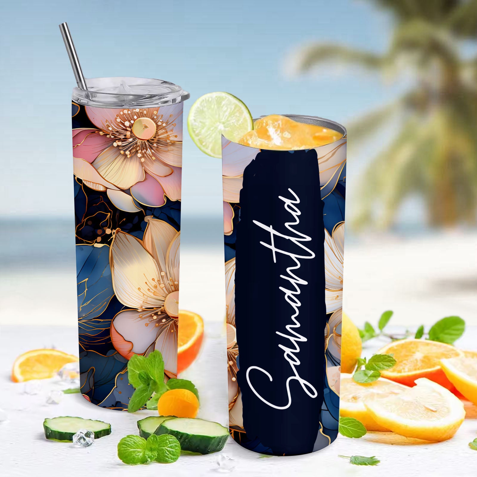 Custom Floral Tumbler Personalized Name Beach Water Cup