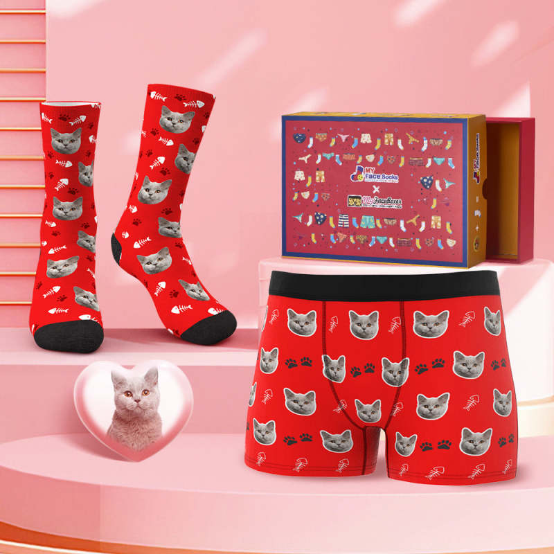 Custom Face Boxer Shorts And Socks Set Cute Cat Co-Branding Set