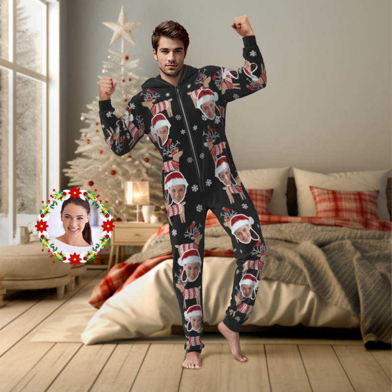 Custom Face Christmas Elk Onesies Pajamas One-Piece Sleepwear Christmas Gift