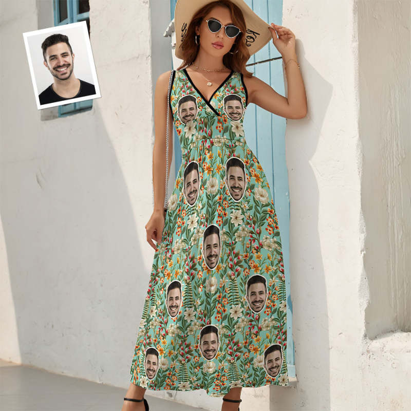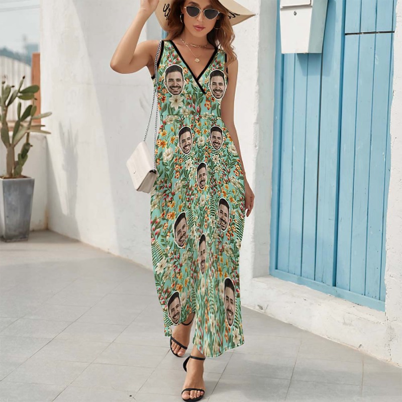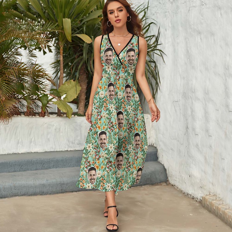 Custom Face Fashion Floral Print Dress Personalized Beach Dress Casual Loose Party Long Dress