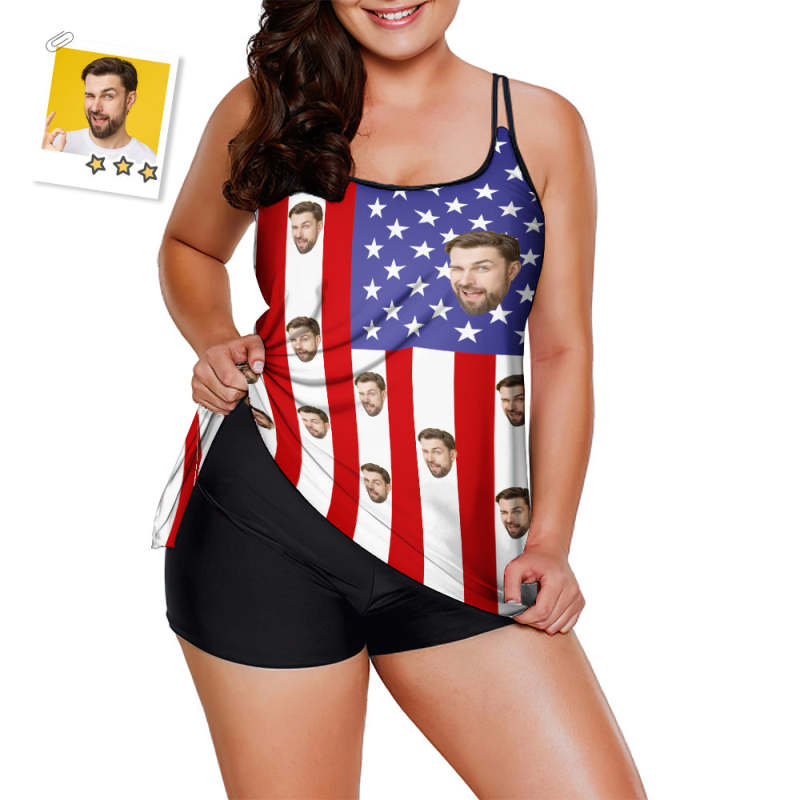 Custom Face Swimwear American Flag Tankini Bathing Suit for Women 2 Piece Swimsuit