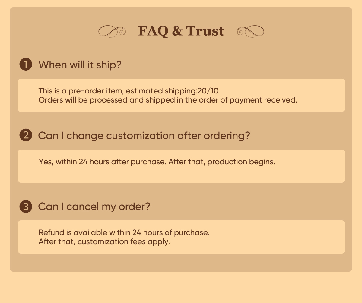 - 3. For personalized products, if you need to cancel or replace the product or replace the personalized content, you will have to pay 30% of the product price as the customization fee. (Special note: Even if you contact us immediately after placing the order to cancel/modify the order, we will charge the corresponding production fee because the customized product will be produced immediately once the order is placed in order to ensure a timely production and delivery. Thanks for you understanding.)