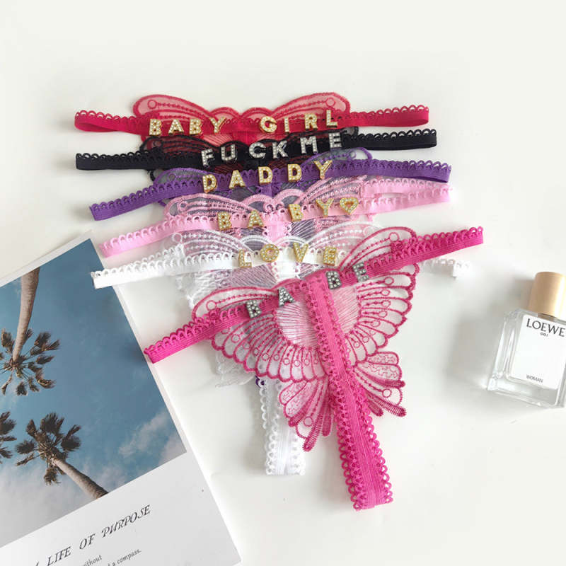 Custom Lace Hollow Butterfly Sexy Low Waist Panty with jewelry Crystal Letter Name Open Cut Thong Underpants Women's Underwear