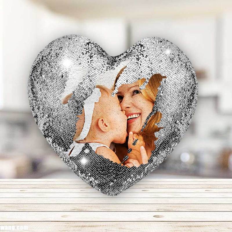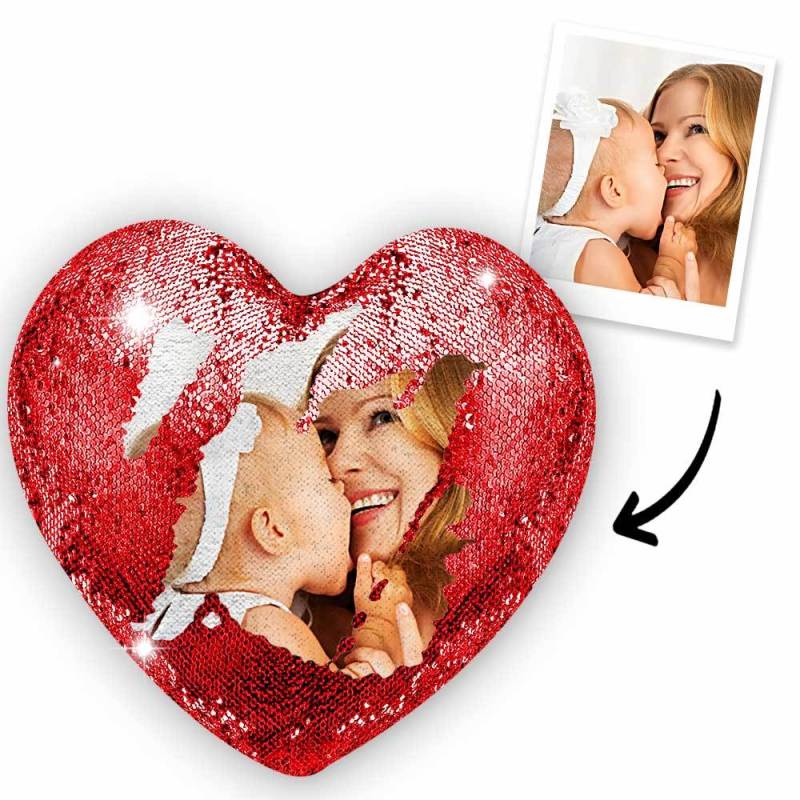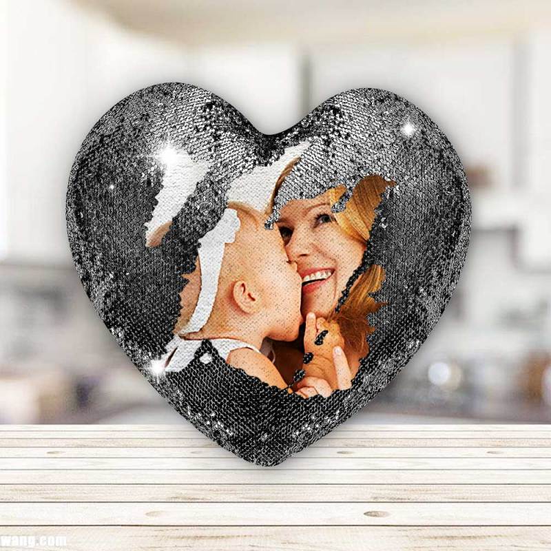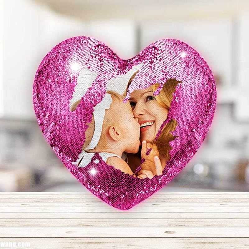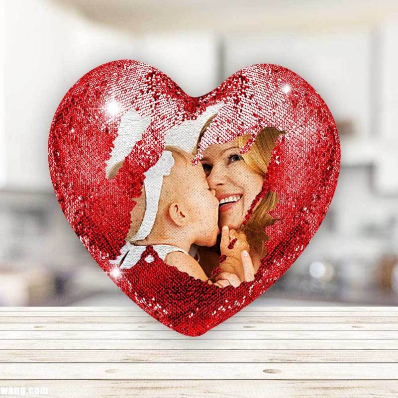 Mother's Day Gift - Custom Love Heart Photo Magic Sequin Pillow Multicolor Shiny - For Mom
