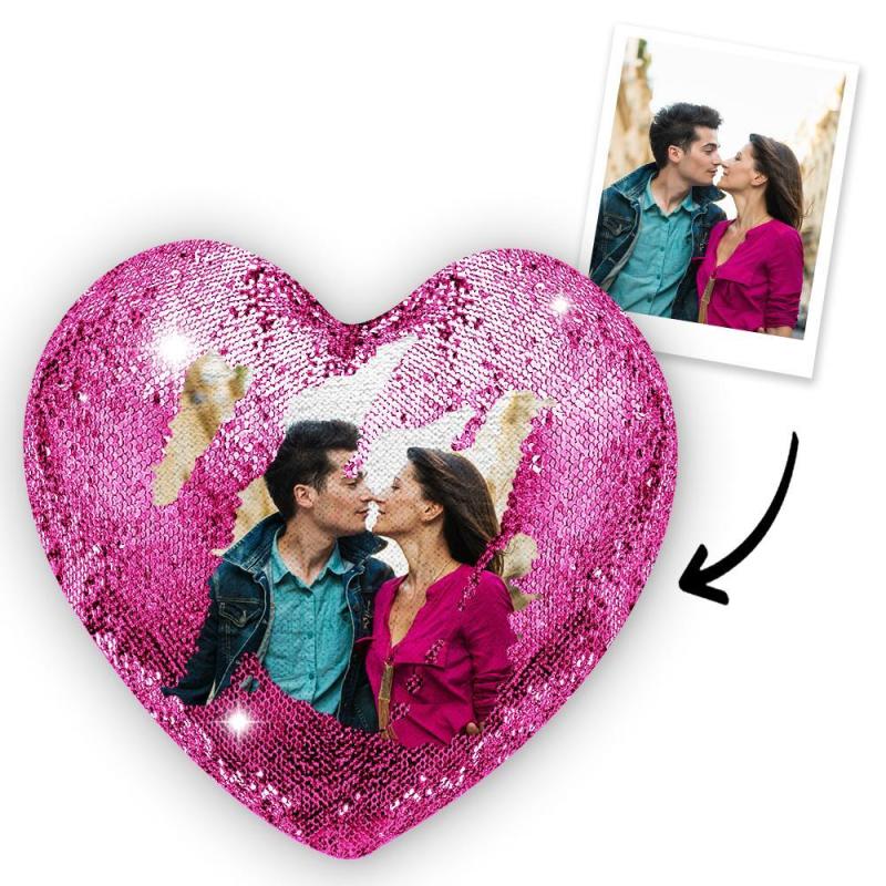 Custom Love Heart Photo Magic Sequin Pillow Multicolor Shiny