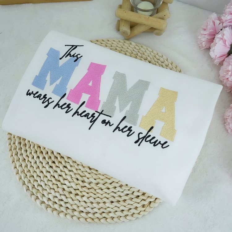 Embroidered Custom Mum Wears Her Heart On Her Sleeve T-Shirts, Sweatshirts, Hoodies