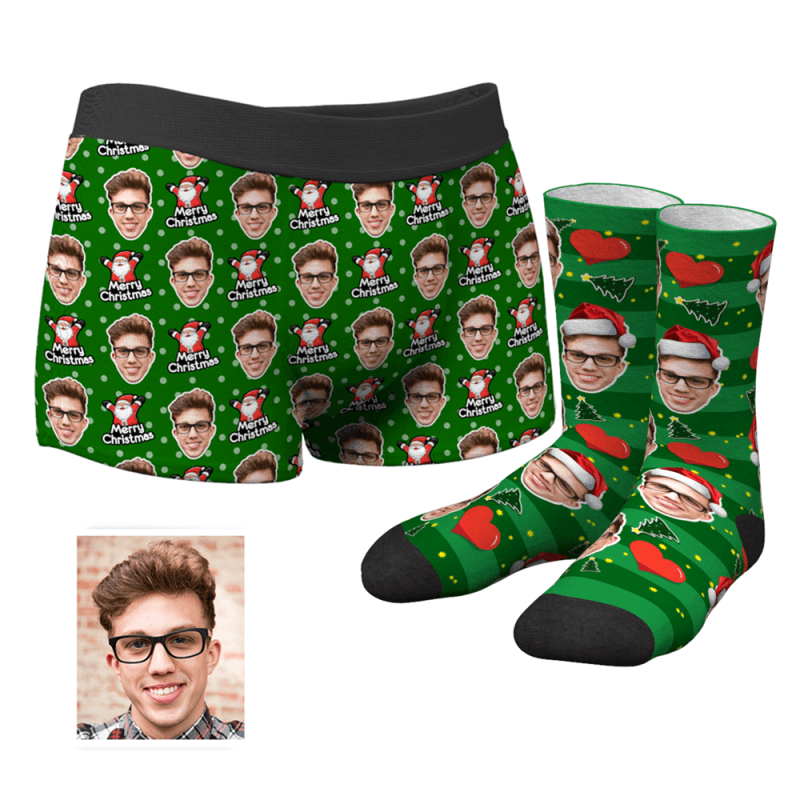 Men's Christmas Hat Custom Santa Claus Face Boxer Shorts And Crew Socks Set
