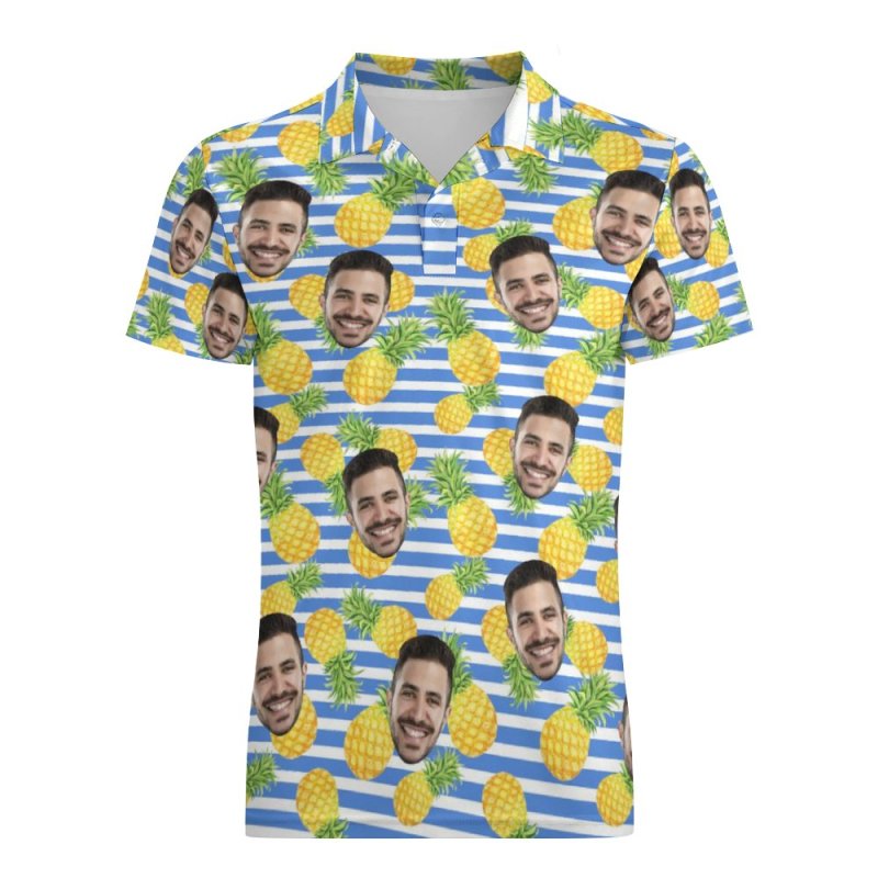 Men's Custom Polo Shirt Blue Stripes with Pineapples Personalized Hawaiian Golf Shirts
