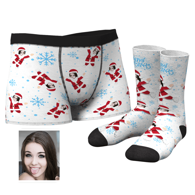 Men's Snowflake Boxers Face on Santa Claus's Body And Crew Socks Set