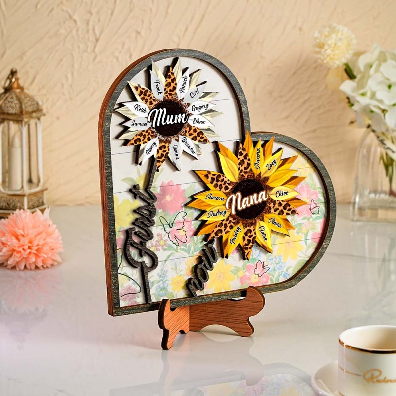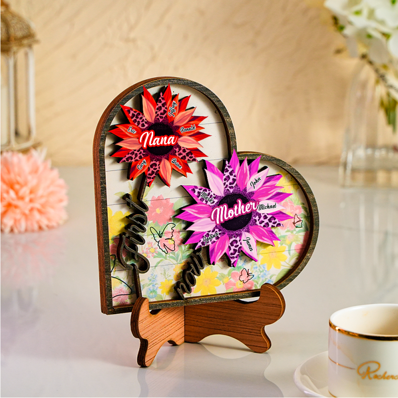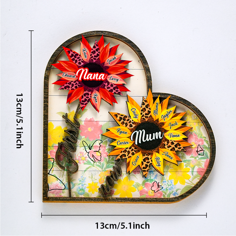 Personalized Names Wooden Plaque Heart Sunflower Gifts for Mom, Grandma Family Home Decor