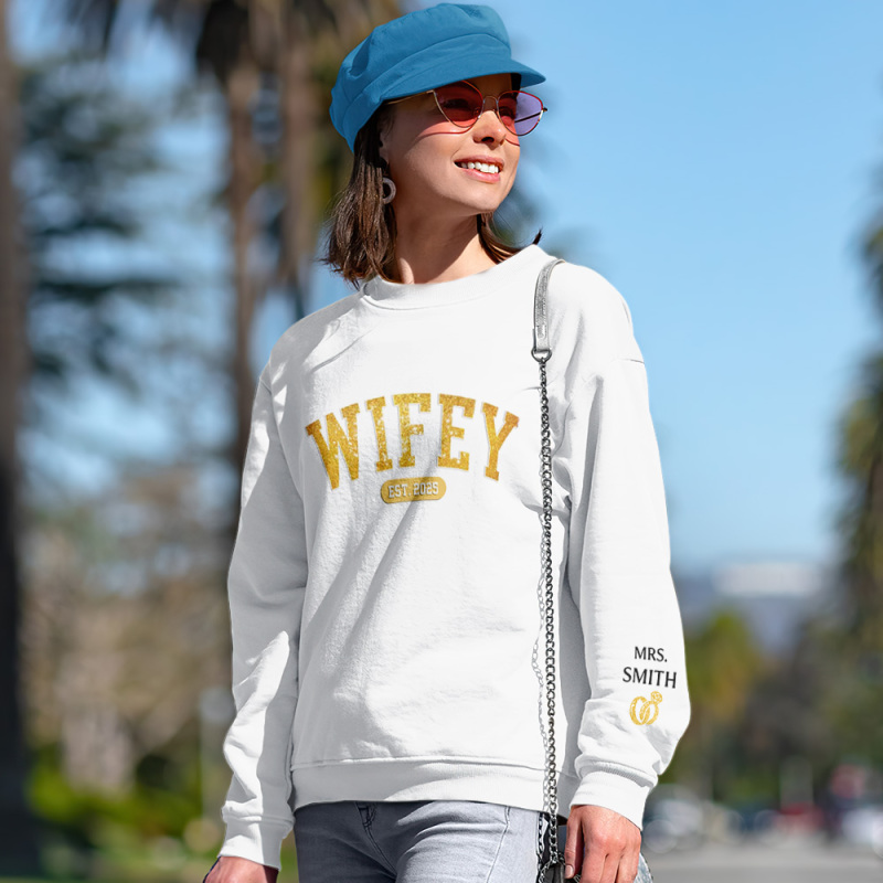 Wifey Est - Couple Personalized Custom Unisex Sweatshirt With Design On Sleeve - Gift For Husband Wife, Anniversary